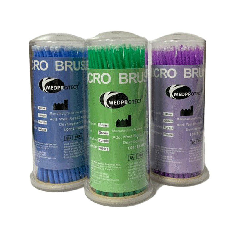 میکرو براش ها برای استفاده از مواد دندانپزشکی به طور مستقیم بر روی ترمیم های دندان استفاده می شوند. این براش های کوچک برای مناطق داخل دهان که دسترسی به آنها دشوار است و همینطور برای مناطق کوچک که نیاز به استفاده از چسب، پرایمر و ژل های سفید کننده دارد، بسیار ایده آل می باشند. میکروبراش مد پروتکت MEDPROTECT با طراحی نازک و نوک براش طولانی کار دندانپزشک را آسان نموده و با تنوع سایز اعمال آسان و دقیق متریال دندانپزشکی را در نواحی مختلف و غیر قابل دسترسی دندان ممکن می سازد. این میکرو براش با طراحی به صرفه و اقتصادی خود در مصرف مواد تا 80% صرفه جویی می کند.